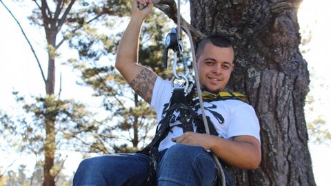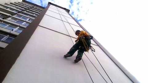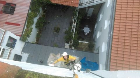 Impermeabilización de fachadas, cubiertas, tejados, terrazas, patios de luces y medianeras; colocación, sustitución y reparación de bajantes y canalones; sellado de grietas; montaje y desmantelamiento de chimeneas y conductos de aireación; instalaciones de elementos publicitarios; limpieza de cristales; trabajos de albañilería en general; pintura interior y exterior; o podas en altura. Este extracto de la página corporativa de Miguel deja claro que, como apunta Ángel, «isto non é un deporte». La especialización -por hacer, hacen hasta informes fotográficos- forma parte de esta profesión, en la que el estado físico también juega un papel clave. Toda labor que se realiza, o al menos la mayoría, hay que hacerla colgado de una cuerda.