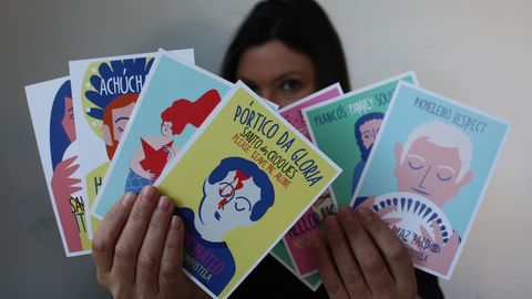 Elga Fernández ya había ilustrado numerosos rincones de su ciudad natal, Ferrol, pero «Santiago es la ciudad más espectacular de Galicia», dice, y pensó en hacer algo que se saliera de las convenciones en torno al Camino y pudiese también gustar fuera. Además de su Pórtico colorista, en formato tríptico, ha lanzado ocho originales postales de temática picheleira.