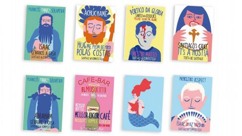 Las ocho «postales para guiris», como las bautizó Elga Fernández, inspiradas en Santiago siguen la línea de las anteriores. Tienen un punto de «crítica social, reivindicando desde el humor», señala la diseñadora afincada en Valencia. Es una obra «rápida y furiosa, porque las hago en poco tiempo y suelo estar muy enfadada. Por ejemplo, las postales sobre las figuras de Isaac y Abraham del Pórtico que tiene en su poder la familia Franco las hice desde la rabia cuando la noticia saltó a la luz pública», explica.