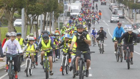 El paseo marítimo de Xuvia sirvió un año más de meta a los jóvenes ciclistas -alumnado de tercero a sexto de primaria- que llegaron en tropel, pertrechados con los correspondientes cascos y chalecos, acompañados del equipo de educación vial de la Policía Local, profesores y miembros de las Anpas. También un nutrido grupo de padres -unos 200- optó por sumarse a la cita, pensada para sensibilizar acerca de la importancia de cambiar los hábitos de transporte del conjunto de los vecinos.