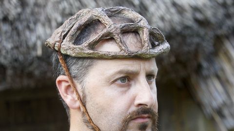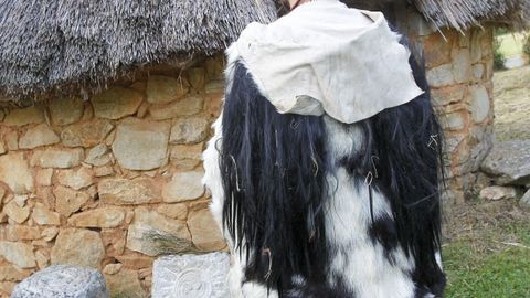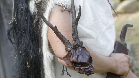 Él se pone también una capa con piel de cabra, que usaba más bien la gente de poder del castro o los más humildes en días de gala. Asimismo, lleva unas calzas de cuero con calcetines largos de lana. Todo esto lo acompaña de un casco, en su caso una reproducción de uno que se encuentra en el castillo de San Antón; un adorno en el brazo que imita a la cabeza de un corzo; y un puñal de sacrificio que copió de uno hallado en un asentamiento de Alemania. «Los adornos demostraban el poder», añade Juan.