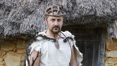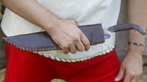Este naronés lleva desde hace quince años inmerso en el Oenach y, con el paso de los años, se ha ido documentando más para ser el castrexo perfecto. «Llevaban una vida muy austera, no eran nada ostentosos, no buscaban el poder. Y eso se traducía en su ropa», explica Juan. La vestimenta de verano solía ser de dos piezas (casaca y pantalón) o una (sobrecamisa larga). Juan opta por una casaca de manga corta de lino y un pantalón corto rojo, que servía para aguantar las altas temperatura que, pone de ejemplo, había en la alta montaña de Galicia. «Las referencias son escritos de los romanos, no se conserva ninguna vestimenta de aquella época», apunta.