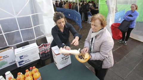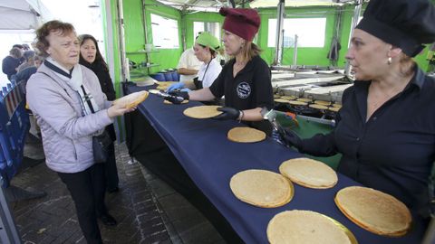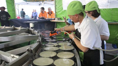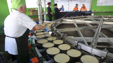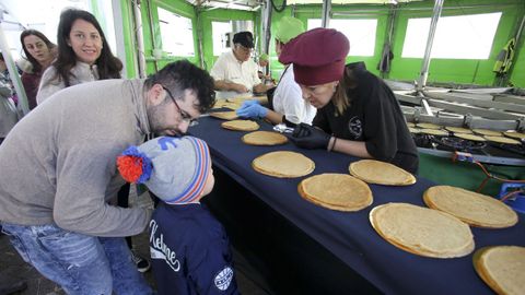 Orlando Vázquez está al frente de la máquina gigante con la que cocinan 800 litros de la masa que se ha convertido ya en toda una tradición del Día de Narón. «Tenemos previsto trabajar seis horas, a mil cuatrocientas por hora...», comentaba antes de comenzar el servicio. Cuatro personas se compaginan para que la filloeira funcione a pleno rendimiento. «Una unta, otra echa, otra le da la vuelta y la otra la saca», explica. La receta de sus filloas, «muy sencilla»: «Harina, agua, huevos y sal. No lleva más nada. Es la filloa tradicional de Galicia», explica. Reconoce que «da mucho gusto» volver a disfrutar del ambiente de fiestas multitudinarias. «Es genial ver la cola de gente. Tenemos récord de tres horas de colas en las fiestas a las que vamos», comenta. Lleva desde el 2008 trasladándose desde Boqueixón al Día de Narón y bromea con que les nombren naroneses de adopción.