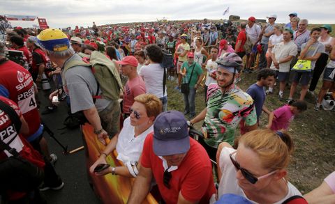 La laguna de A Frouxeira (Valdoviño) lució espléndida en las imágenes de televisión y Cedeira se volcó para recibir a los ciclistas, con la avenida de Castelao y la plaza de Galicia atestadas de gente. Que este deporte despierta pasiones lo demuestran los kilómetros que muchos aficionados tuvieron que completar andando, por la mañana, en el último tramo hasta la línea de meta. Iñaki y Arantxa, bilbaínos, viajaron a propósito para presenciar dos etapas de la Vuelta, la de ayer y la de hoy. Otra familia guipuzcoana aprovechó las vacaciones en la zona para pedalear hasta la sierra de A Capelada (los niños, Joanes y Ekain, se lo pasaron en grande emulando a sus ídolos). Y dos amigos de Lugo peregrinaron en coche a San Andrés de Teixido para continuar a pie hasta el alto de Vixía Herbeira, sudorosos y sedientos, «pero moi satisfeitos de ter vido ata aquí». Ana y Juan, músicos de Cariño, se protegieron del sol bajo un aerogenerador. Otros llevaron sombrillas y hasta paraguas, neveras o tinas con bolsas de hielo. Muchos ascendieron en bici. En el mirador de Os Carrís se apelotonaban los coches ya a media mañana, como en O Cruceiro. El ansia por disfrutar de esta experiencia -«nesta paisaxe única e este día radiante», resumió Luisa, vecina de Ortigueira- llevó a parejas y pandillas a apostarse en cualquier curva -«es donde mejor se ve», constató Jesús, madrileño que veranea en la zona, como sus amigos-, mejor en sombra, lo más cotizado a medida que avanzaba el día y el sol pegaba sin clemencia alguna.