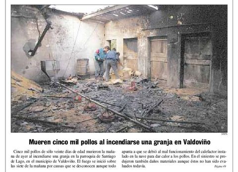 08 feb 2017 . Actualizado a las 05:00 h.«Un incendio originado la mañana de ayer en una granja de la parroquia de Lago, en el Ayuntamiento de Valdoviño, provocó la muerte de cinco mil pollos y pérdidas materiales que todavía no han sido evaluadas». Con estas palabras comenzaba una noticia publicada por La Voz de Galicia hace hoy justo dos décadas, el 8 de febrero de 1997.