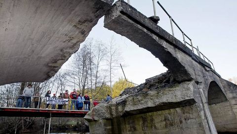 En cuanto a la plataforma provisional, algunos ni siquiera se atreven a usarla para el paso del ganado. Josefa López, otra vecina de Vilanova, explica que una vaca suya cayó al río y rompió tres costillas. Cuando le nació la cría, murió al poco tiempo. No es el único caso de vacas que caen al río al cruzar la plataforma y pierden allí mismo la cría.