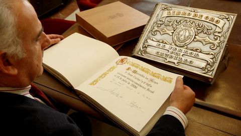 Es el más espectacular. Quizá no por sus firmas, con excepciones, la mayoría protocolarias y escuetas, pero sí por su cubierta maciza de plata repujada con letras de oro que convierten su valor en «incalculable». Así lo asegura el jefe de Protocolo, Manuel Sánchez Hermida, que recuerda que «la última vez que lo llevamos a tasar ya nos dijeron que valdría entre 10.000 y 15.000 euros». Una aproximación material que no tiene en cuenta su valor simbólico. Además de la firma del dictador y de otros miembros del régimen franquista después llegaron las de los reyes, el príncipe de Asturias, ministros, y referentes de las arte, las letras y las ciencias. Porque a través del libro se recorre la historia local: desde botaduras a la rotura del puente de As Pías, pasando por el ascenso del Racing, los premios del Día de San Xoán o los galardonados del José Couso.