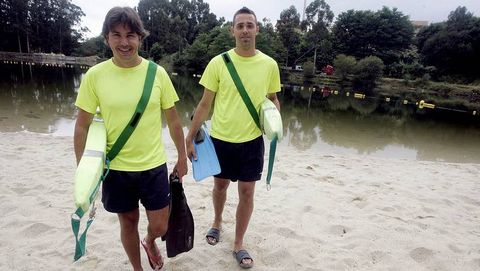 Estos dos jóvenes -de 29 y 25 años, respectivamente- son los socorristas de la playa fluvial pontevedresa durante la época estival. De doce de la mañana a las ocho de la tarde se aseguran diariamente de que no suceda nada a orillas del Lérez.