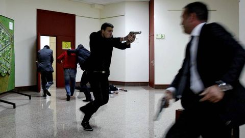 El edificio central de la Tecnópole fue el lugar escogido para la escenificación del ejercicio, en el que no faltaron las pinceladas de realismo. Humo improvisado y balas de fogueo para que los futuros escoltas sepan lo que pueden encontrarse cuando alguien quiere secuestran a la persona a la que ellos deben proteger. «Este ejercicio se hace en un lugar interior porque el factor sorpresa siempre es mayor», explica Gómez Lesta, quien describe que serán cuatro terroristas los que tratarán de secuestrar al personaje, sin importarles sin en el intento alguien muere. Y pese a que hay heridos, de mentira, claro, cuando atacan los malos uno de los buenos reacciona a tiempo y se lleva a toda prisa al protegido. En este simulacro, como en casi todas las películas, los malos al final perdieron.
