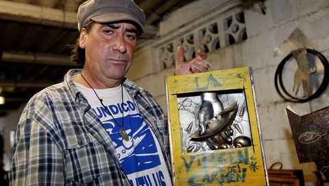 Las figuras de los santos reposan en cajas de vino que son «tuneadas». «Están policromadas y llevan su peto con candado para que no vengan los niños y se lleven el dinero; ¡Cantas veces levei os cartos do peto da Virxe do Carmo!», recuerda el artista. Y aquí está la explicación al «granito a granito». Algunas de las casi treinta figuras serán vendidas tras ser expuestas, pero el resto comenzarán a circular por casas de particulares interesadas en este alquiler artístico. «Es aquí donde aplico la estrategia de la Iglesia por eso para que funcione esto la gente tiene que poner fe y monedas», señala.