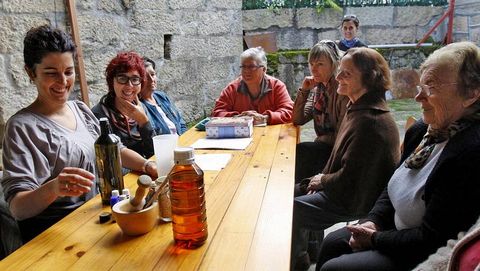 «A lavanda, que é sedante e calmante, pega moi ben co tomiño que baixa a inflamación», explica Zeltia mientras inicia, bajo la atenta mirada de las mujeres, el mezclado de todos los ingredientes, medidos, en un gran recipiente, para más tarde repartir el contenido entre las mujeres.