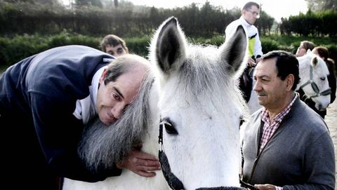 Uno de los que muestran más alegría al montar a la yegua es Adán Martínez Orge, un joven de 21 años que sufre parestesia. Este vecinos de la parroquia de paredes tiene problemas de movilidad. «Es la segunda vez que monto y me ha gustado mucho», dice mientras se inclina sobre la cabeza del caballo y le acaricia.