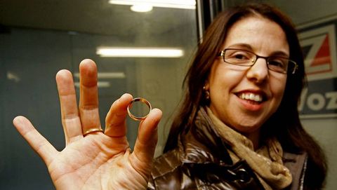 1 Es una versión de andar por casa de El Señor de los anillos. Una bondadosa vecina de A Coruña encontró una alianza en el céntrico y concurrido parque infantil de la Marina. «Fue el martes pasado. Estaba debajo de uno de los columpios», comenta Lara, a la que se le ocurrió llamar a Radio Voz para dar publicidad al hallazgo e intentar así encontrar a la persona que lo perdió. En la parte interior de la pieza figura el nombre de Conchi y una fecha del verano del 2006, lo más probable el día de la boda de esta mujer con el hombre que perdió el anillo, por el hecho de que lo normal es llevar el nombre de la esposa en el mismo. Cuadra, por lo tanto, con que pueda tener un niño pequeño al que llevar a un parque infantil. Por cierto, al hilo de este asunto descubrí que hay cantidad de gente que extravió el anillo de casado, hasta el concejal de Urbanismo, Martín Fernández, comentó ayer en Radio Voz que un sobrino se puso a jugar con él y se le fue por un desagüe. Ahora habrá que ver si gracias a Lara por lo menos el propietario de esta alianza la recupera.