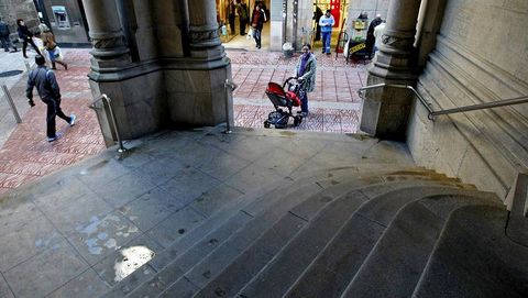 En un mes, Ánxela, madre de un niño de ocho meses, ha puesto dos reclamaciones a la oficina de Correos por no haber podido acceder con la silla de su bebé al interior del vetusto inmueble. Subir las imponentes escaleras de la entrada del edificio de la confluencia de las calles Oliva y García Camba, que data de 1929, es misión imposible sin brazos de hierro, y en el acceso lateral, la entrada se limita a personas discapacitadas, como le indicaron al otro lado del telefonillo.