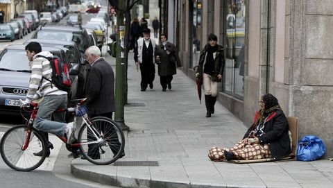 La mafia hace madrugar a su plantilla. A la hora en la que se reparte el pan, ya hay una docena de personas, sobre todo mujeres, pidiendo limosna en la plaza de Lugo. Unas extienden su mano en las escalinatas de la iglesia de Santa Lucía, otras se reparten los negocios más frecuentados de la zona, sobre todo panaderías y supermercados. Sobre las dos de la tarde disfrutan de una hora para comer -la dieta no pasa de un mendrugo o una palmera de chocolate- y vuelven a sus puestos hasta que termina la última misa del día, sobre las ocho de la tarde. «No acosan ni molestan a los clientes. Por ahí no hay queja», explica la dependienta de una tienda de Padre Feijoo.