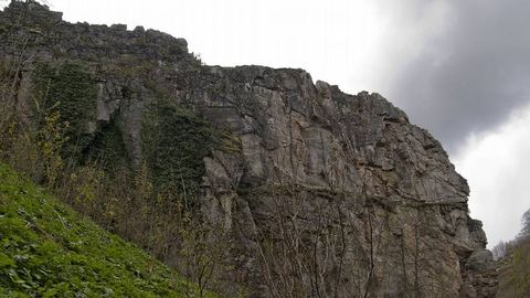 Lo que se levanta a ambos lados de la carretera es una especie de muralla -lo que se conoce en geología como un dique- de unos 150 metros de longitud, que seguramente es solo la parte más visible de una estructura mucho más grande y que puede ser recorrida de un extremo a otro. La sección del dique más alejada del río puede visitarse subiendo por una senda que corre pegada al pie de la pared, que fue desbrozada hace poco por Orlando Gregorio Álvarez, miembro de la asociación ecologista SOS Courel. El punto de inicio está marcado con el número en el croquis de la derecha, donde se indica cómo realizar la visita.