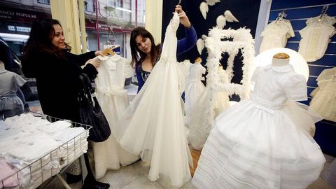 Para este tipo de citas, ya se sabe, hay que vestirse como es debido. Pina Illuzzi regenta en Vilagarcía una tienda en la que se puede encontrar todo lo que necesitan los protagonistas de las ceremonias. Este año, Pina le tenía miedo a la crisis. Pero aunque las estrecheces económicas se dejan notar, no está saliendo la cosa tan mal como en principio imaginaba. «La gran diferencia es que aquí, este año, viene gente a arreglar vestidos que habían comprado otros años. Y, sobre todo, se nota que quienes vienen a comprar son los abuelos», obligados a echar una mano también en estas lides. Así que no es de extrañar que los vestidos que triunfan esta temporada «sean muy clásicos, los de toda la vida, con cuello de bebé», explica Pina. Entre los niños se imponen los trajes de marinero.