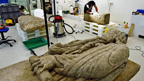 Estos días, el taller acoge un movimiento mayor del habitual. Por las dependencias están pasando las más de 70 piezas que necesitan algún tipo de tratamiento para su exhibición en la colección permanente que albergará el edificio que completa la gran ampliación del museo pontevedrés, el Sarmiento, cuya inauguración está prevista para agosto. Por eso el tiempo apremia y la plantilla habitual de tres restauradores se ha ampliado a siete. Divididos por áreas (piedra, arqueología, azulejería y cerámica), todos se afanan en sacar lo mejor de los tesoros artísticos que guarda el museo, aunque en este campo las prisas no valen. «No sabes realmente cómo están las piezas hasta que empiezas a ver», contaba Óscar Taboada cuando comenzó la restauración de dos de las piezas más emblemáticas, dos profetas que proceden del pórtico de la Gloria de Santiago.