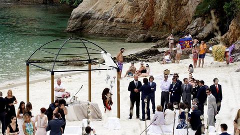 1¡De boda en la preciosa playa de O Caolín, en O Vicedo!. Es uno de los rincones idílicos que tiene A Mariña, que los vicedenses guardan como oro en paño, y que ha sido el lugar elegido por la pareja formada por María Jesús Valcarce Pérez, Chus para amigos y familiares, y por el coruñés Iago Cabezas Álvarez para decirse ayer el «sí, quiero». Un empresa especializada se encargó de decorar un espacio natural vinculado a las vivencias infantiles de la novia, que siempre quiso que la pequeña cala fuera el escenario de su boda. Y se cumplió ayer a las seis de la tarde, al borde del Cantábrico y con el magnífico entorno de O Vicedo-Barqueiro de fondo.