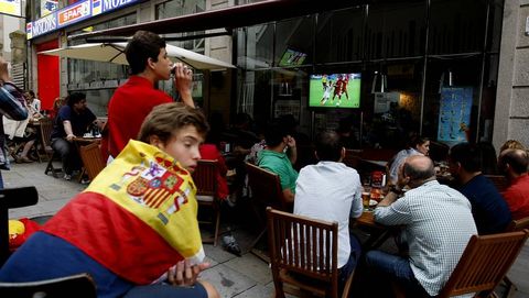 20 jun 2014 . Actualizado a las 07:00 h.Gritos, emociones, ilusiones y también frustraciones. El Mundial hay que verlo entre amigos, disfrutando de una buena tapa y de una buena caña, un buen vino o lo que se tercie. Y si la temperatura es buena, qué mejor que la terraza de un bar para disfrutar de los goles. Lástima que España no los metiera, que se despida tan pronto del campeonato y que su eliminación haya sido tan rápida, a falta de jugar contra Australia. Son muchos los establecimientos de hostelería de la ciudad que le dieron la vuelta a los plasmas para que su clientela pueda ver los partidos desde los veladores exteriores. El debut de La Roja contra Holanda, que coincidió en viernes, comienzo del fin de semana, el ambiente en la calle era espectacular. El pasado miércoles, en cambio, cuando los chicos de Del Bosque se enfrentaron a Chile las terrazas con tele seguían más o menos llenas, pero era mucho más fácil encontrar una mesa. «Es que mañana hay que trabajar y la gente se queda en casa», comenta un aficionado que acaba de sentarse en una de las terrazas de la plaza de Curros Enríquez.