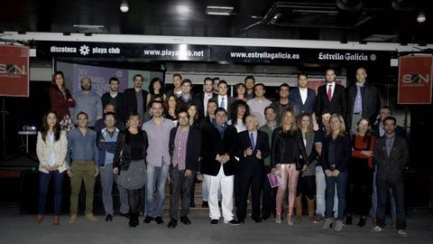 1Tres m¡nutos para explicar su proyecto. Es el tiempo del que dispusieron los responsables de las 26 empresas candidatas a los premios Emprende Coruña para explicar las claves de sus negocios. La gala Up & Forward se celebró anoche en el Playa Club como antesala de la entrega de galardones que se celebrará el próximo miércoles en el palacio municipal de María Pita bajo la organización de la Asociación de Jóvenes Empresarios, que preside Óscar Valcuende. Una jornada que sirvió para demostrar que en la ciudad hay muchos y jóvenes emprendedores y para que estos se conociesen mejor de cara a establecer acuerdos empresariales. Antes de subirse al escenario a contar sus respectivas iniciativas (utilizando la técnica elevator pitch o conversación del ascensor) los representantes de las firmas candidatas posaron todos juntos.