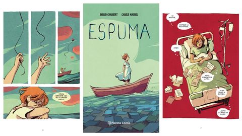Y qué bien resuelto está todo ese conflicto en Espuma. Sobre todo porque quien lo cuenta sabe lo que está diciendo. La escritora Ingrid Chabbert, especializada en libro infantil y juvenil, pasó por un doloroso aborto y decidió que la mejor manera de exorcizar aquello es ponerlo por escrito y buscar alguien que ponga en imágenes sus sensaciones. Se lo encargó a Carole Maurel, una creadora desconocida en España pero que demuestra que dibuja de maravilla.
