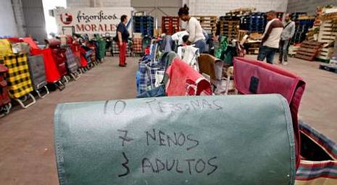 «Es muy fácil, solo tiene que seguir a los carritos». Amadora, la responsable del centro, intenta darme por teléfono unas explicaciones para dar con la nave. Tras un rato de incomprensión, zanja la charla: «Es muy fácil, cuando llegue, solo tiene que seguir a los carritos». Pero llego con tiempo, antes que los carros, a un alejado hangar de carga, en uno de cuyos muelles se ha instalado el banco. Por allí andan Amadora y los voluntarios que atenderán hoy a un centenar largo de demandantes. Es martes, el día de las familias. Solo se recibe a gente en situación extrema: sin ingresos y en hogares con cinco personas o más; los más castigados por el incesante golpeo económico. El jueves viene el resto, una legión de más de 400 almas. Y el viernes, otra veintena de familias, también en situación extrema, que se desplazan desde otros puntos de la provincia.