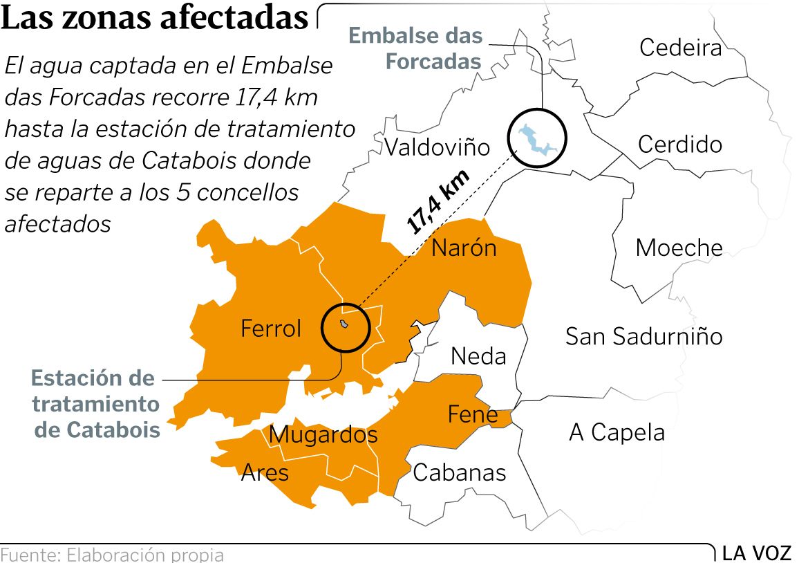 En la comunicación enviada ayer a los ayuntamientos, la Xunta recogía que los pasados 6 y 13 de julio se mantenía el incumplimiento de los parámetros estipulados y por eso instaba a los concellos afectados a poner en marcha medidas para restringir el uso del agua de la traída hasta rebajar los niveles de trihalometano.