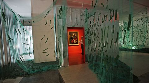 Porque en el interior de ese espacio en el que, teóricamente, tendrían que estar expuestas las obras, lo que hay son varios contenedores de forma cuadrada. Como cubos. Son rojos por dentro. Tienen iluminación propia, adecuada a los cuadros que penden de sus paredes o a lo que guardan en sus vitrinas. Es una sala dentro de otra. Y cada cubo está forrado de un material color plata. Como hilo conductor entre los cubículos, hay una especie de sendero bordeado por pequeños trozos de madera marrón y marcado por redes verdes que cuelgan del techo en un ambiente de oscuridad y misterio. Todo el atrezzo conforma un laberinto en el que, de vez en cuando, se ve la sombra del guardia jurado que custodia las obras diluidas en esas guaridas que esconden desde un Durero hasta imágenes de Cristo. Ver un cuadro con la perspectiva de la distancia resulta aquí complicado.