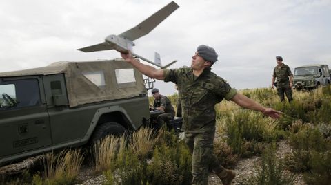 El cabo De Lima realiza el lanzamiento, manual, a contra viento y el dron comienza a volar. En una misión cotidiana, desaparecería de la vista. Puede alcanzar una altura de hasta 300 metros. Ayer sobrevoló los montes de A Gudiña, muy castigados por los incendios.