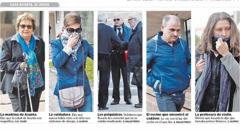 Profesoras de música. Intentaron esclarecer un episodio en el que Asunta Basterra acudió «drogada» y «como sonámbula» a sus clases de música el 22 de julio. La niña aseguró a una de sus profesoras que había estado durmiendo dos días y se mostró indispuesta en clase. «Asunta estaba mareada, dijo que había tomado unos polvos», explicó la docente, quien reprodujo la siguiente conversación; «¿Quién te los dio?». «Mamá», dijo la niña. «¿Y a mamá?», preguntó la profesora. «Una señora en el portal», replicó la menor. Tras esta conversación, la pequeña le dijo: «Nadie me quiere decir la verdad, yo no tengo alergia pero me dieron unos polvos blancos». «La niña estaba como drogada», concluyó una de las maestras.