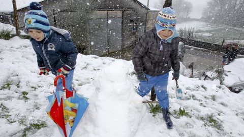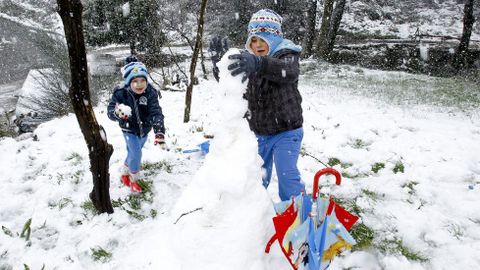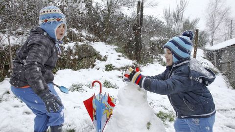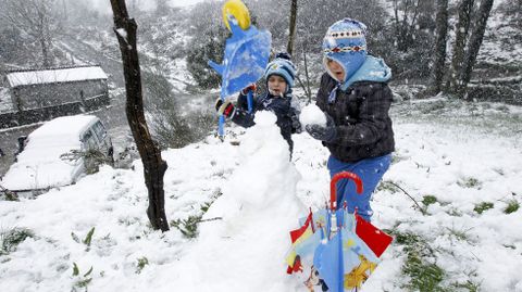 A Pablo y Manuel no les ha parecido suficiente la nieve que ha caído en los últimos días sobre la montaña. Les sabe a poco. Viven en Valinfolgueiro, a unos pocos kilómetros de O Cádavo. «Este ano aínda non nevou para esquiar co saco na ladeira», dicen los dos hermanos. Su madre María José lo corrobora: «O ano pasado estivemos esquiando cunha lona alí no pastizal da Carballeira. Incluso veu xente de aldeas de cerca. Pasámolo moi ben». Este año han tenido que conformarse con hacer un muñeco de nieve, pero delgaducho.