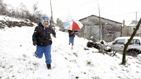 Que no haya clase en invierno por la nieve no es extraordinario. «Esta mañá -por ayer- a estrada estaba un pouco cuberta e xa non veu o transporte», dice Manolo, el padre. Normalmente los recoge a las nueve para empezar las clases media hora después. Comen en el comedor y llegan a casa de vuelta a las cinco de la tarde. Pero ayer tuvieron todo el día para jugar fuera y calentarse luego al fuego del hogar.