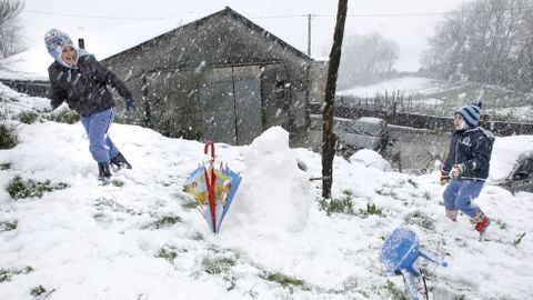 Alumnos del colegio público de Baleira, uno de los 33 concellos en los que ayer no hubo clase por el temporal, pasaron el día entre la nieve y sus tractores de juguete