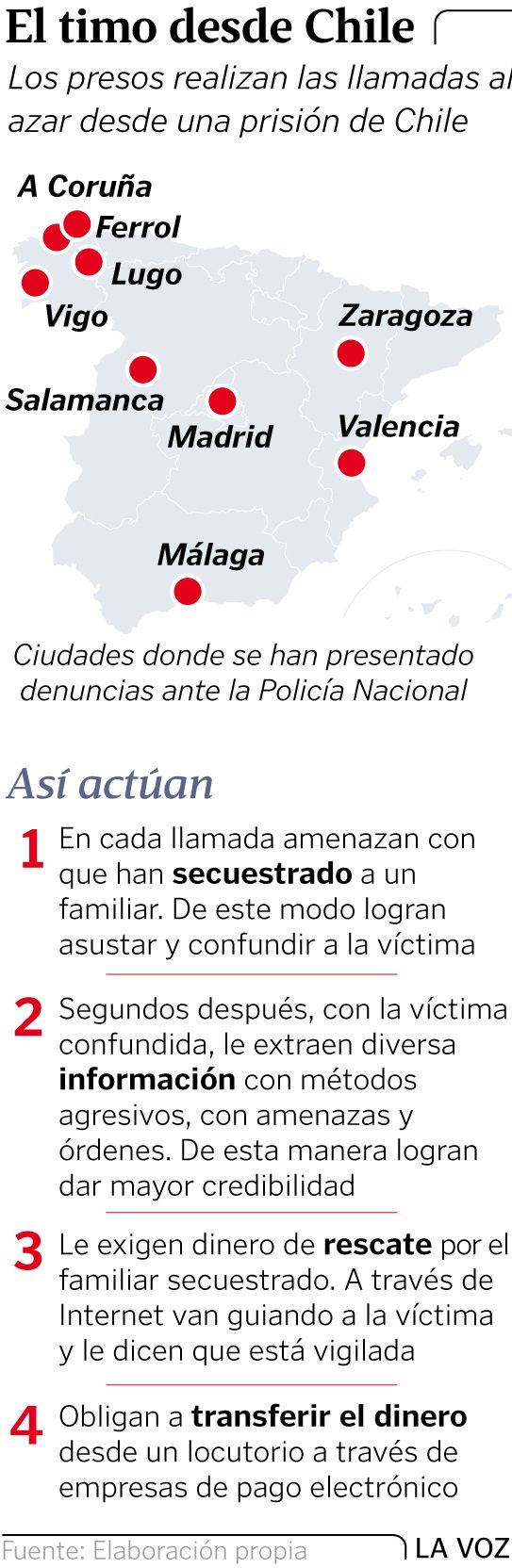 En los últimos años se han disparado las llamadas exigiendo dinero por falsos raptos. Se hacen desde Chile y ya se han detectado casos en Vigo, Lugo, A Coruña y Ferrol