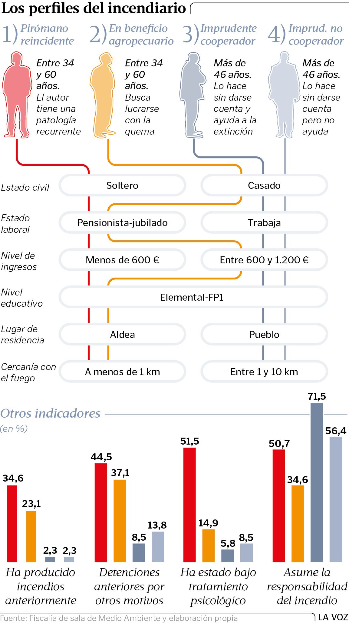 En el informe de la Guardia Civil realizado en la resaca de la ola de incendios del verano del 2006 se esbozaron unas primeras pistas para elaborar los perfiles de los incendiarios gallegos. Se describieron tres: el imprudente -varón de 50 años, agricultor o ganadero con poca conciencia ambiental-; el incendiario -entre 35 y 50 años con ciertos trastornos psicológicos y dependencias, fundamentalmente del alcohol, que busca a veces beneficio o venganza-; y el pirómano, víctima de una patología que le impulsa a prender fuego sin más motivación que buscar la alarma social. Todos ellos tienen características en común: son varones, con un nivel cultural bajo, sin cualificación profesional y la mayoría actúa en solitario y muy cerca de donde vive. En investigaciones posteriores se ha detectado que cerca de un 27 % de los fuegos se provocan a menos de un kilómetro de la casa del incendiario.