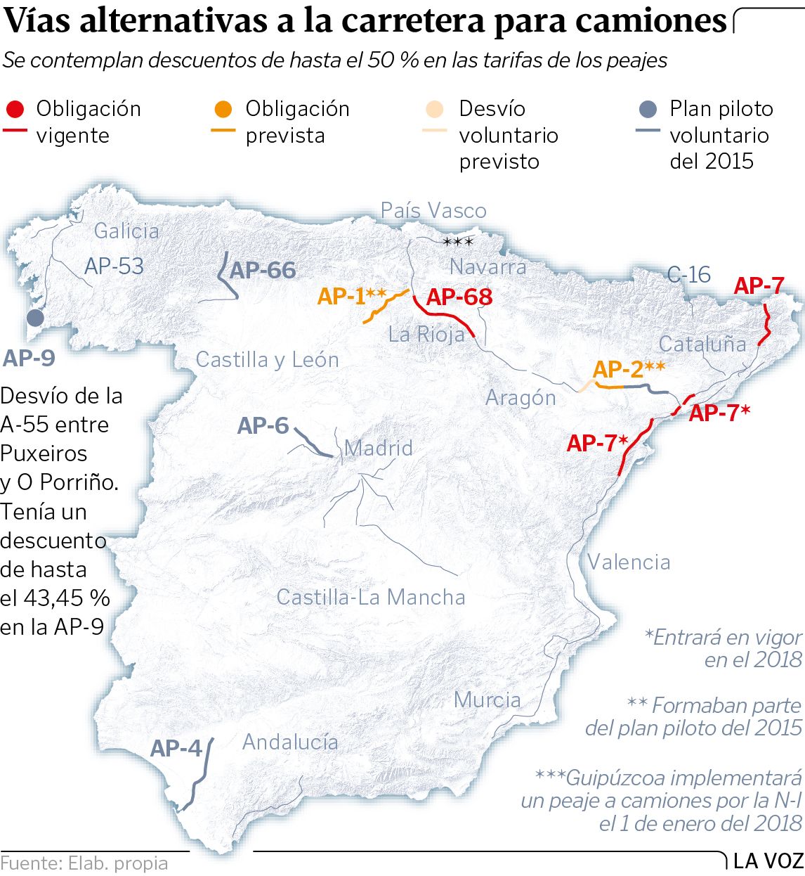 Pero en esta ocasión el ministerio está dispuesto a que la canalización por autopista no sea voluntaria para los transportistas, sino obligatoria a cambio de rebajas en los peajes que oscilan entre el 43 y el 50 %.