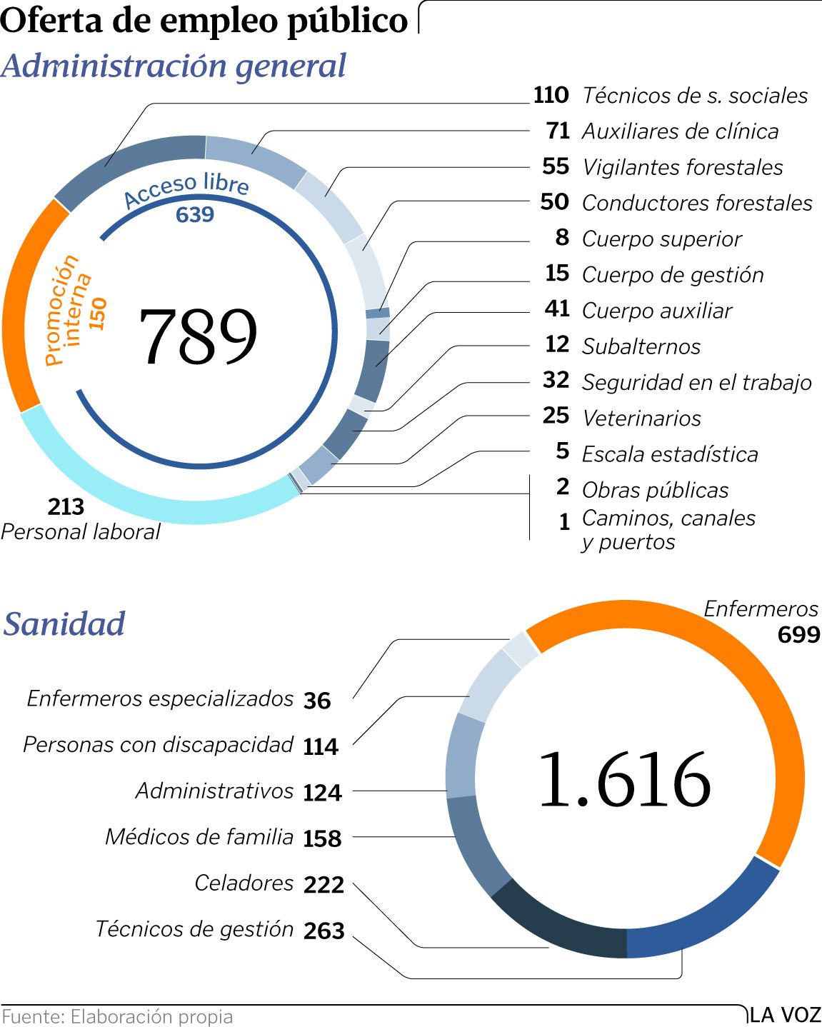 La Xunta culmina así el proceso laboral previsto para el 2017 con la mayor incorporación de empleados públicos desde el 2008, cuando la crisis todavía no se notaba en los presupuestos autonómicos. Con respecto al año anterior se convocan un 10 % más de plazas hasta rondar las 3.400, que es la cifra de referencia que se ha acordado con los sindicatos para los próximos cuatro años hasta alcanzar los 14.750 empleos públicos, según explicó el presidente Feijoo al término de la reunión de su Ejecutivo en la que se dio el visto bueno a la operación diseñada por el conselleiro de Facenda, Valeriano Martínez. El grueso del empleo que se irá generando con esta convocatoria será para integrarse en el Sergas, que tiene reservadas 1.616 plazas y donde se cubre el 100 % de la tasa ordinaria de reposición. El sistema selectivo será el de concurso oposición y respetará los principios de libre concurrencia, igualdad, mérito y capacidad. Está prevista la convocatoria de plazas de las categorías de medicina de familia, técnicos en cuidados auxiliares de enfermería, celadores, ingenieros técnicos y personal del área administrativa. Además, por primera vez, se oferta un total de 36 plazas para categorías de enfermería especialista de familia y comunitaria, en salud mental, trabajo y pediatría.