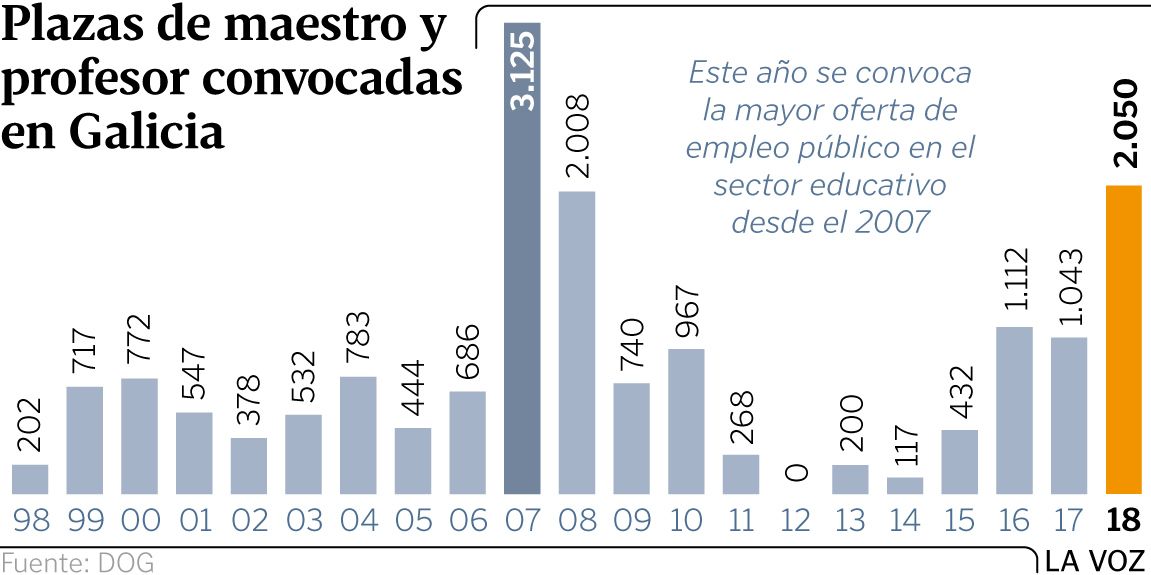 07 feb 2018 . Actualizado a las 05:00 h.El jueves, el presidente de la Xunta anunciaba una oferta pública de empleo docente de 1.919 plazas. El lunes, y a petición de los sindicatos, se reunió la comisión de seguimiento del acuerdo de estabilización de empleo (con CC. OO., UGT, ANPE y CSIF) y reclamaron a la Xunta la convocatoria de un tercio de las plazas. La Administración tomó nota, y lo hizo hasta tal punto que las cifras que ayer puso sobre la mesa sectorial contemplaban 131 vacantes más de las anunciadas por Alberto Núñez Feijoo. Eso convierte la de este año en una de las mayores ofertas de empleo educativo en la comunidad. Entre 1995 y la actualidad solo ha habido otras oposiciones en las que se convocaron más plazas: las del 2007, con una oferta de 3.125 vacantes. El objetivo es reducir dos puntos la tasa de interinidad, que en la actualidad se sitúa en el 13 %. Aunque es la más baja del Estado, el planteamiento es alcanzar un 6 % a través de convocatorias de empleo público.