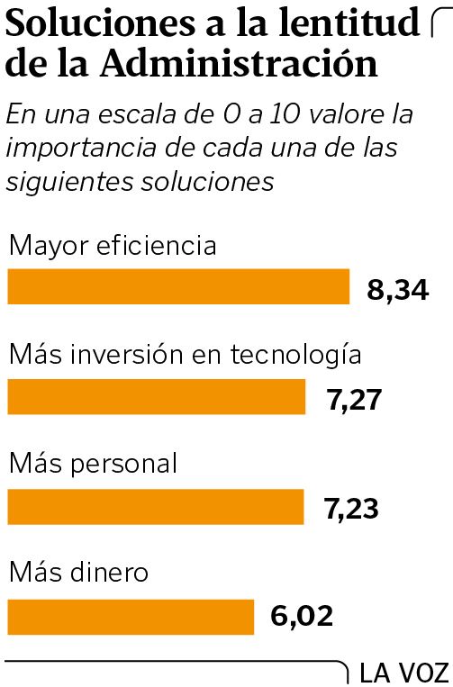 Los gallegos consideran que para resolver los problemas de lentitud de la Administración en la prestación de servicios sería necesario, en primer lugar, una mayor eficiencia. En una escala de cero a diez, es la variable que más puntúan, con un 8,34; le seguirían más inversión en tecnología (7,27), más personal (7,23) y, por último, más dinero (6,02). La tercera exigencia más demandada por la sociedad, más puestos de trabajo, se produce después de años de congelación y recortes en las plantillas, tanto de los servicios administrativos generales, como en educación y en sanidad, sobre todo porque no se han cubierto jubilaciones, una tendencia que empieza ahora a cambiar.