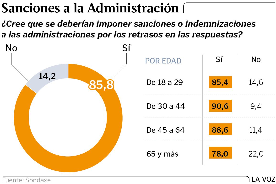 En aras de plantear cuál puede ser una vía para resolver las esperas, la encuesta de Sondaxe pregunta a los gallegos si consideran que se deberían imponer sanciones o indemnizaciones a las administraciones por los retrasos en responder. La respuesta es abrumadora: hasta un 85,8 % de los ciudadanos encuestados se decantarían por esta vía, frente a un 14,2 % que dice que no.