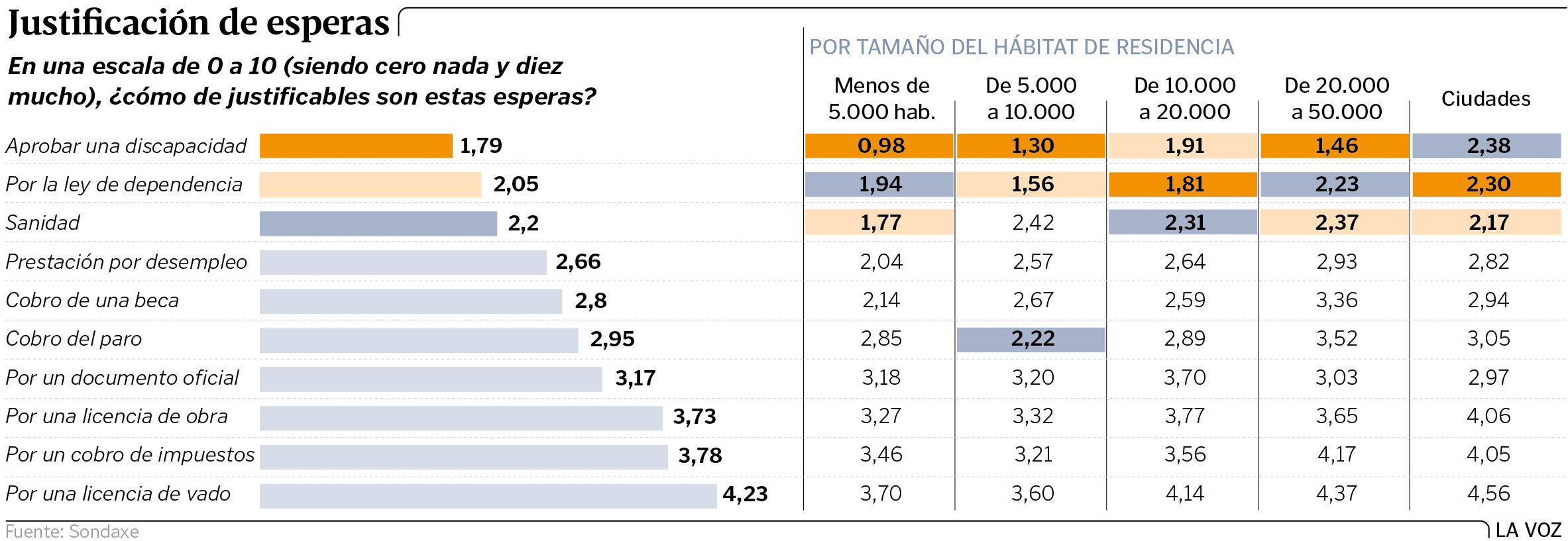 07 may 2018 . Actualizado a las 17:18 h.La espera para lograr el reconocimiento de una discapacidad, para obtener la ayuda de la ley de dependencia o para ser atendido en la sanidad pública constituyen, para la mayoría de los gallegos, los tres retrasos más injustificables en sus relaciones con la Administración pública, unos servicios que los ciudadanos financian con sus propios impuestos. Esta es la principal conclusión que se desprende de una encuesta de Sondaxe elaborada para La Voz.