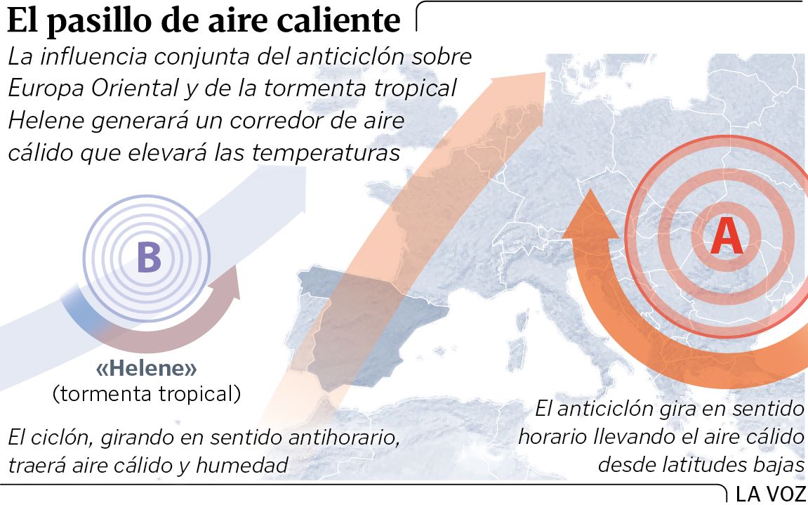 El aire tropical llegó a través de una autopista que crearon Ophelia y un anticiclón. Lo que uno espera de las altas presiones es sol y calor y de las bajas frío y lluvia. Pero eso no tiene por que ser siempre así. A menudo las piezas atmosféricas se colocan de tal forma que un anticiclón puede generar mal tiempo y una borrasca bueno. Esto suele ser habitual cuando estos sistemas meteorológicos se alían. Sucedió con Ophelia y volverá a ocurrir con Helene, que ya se ha convertido en tormenta tropical. El ciclón mantiene su ruta hacia el norte moviéndose por el Atlántico de forma paralela a la Península. Además hay un anticiclón con su centro de acción en el este de Europa. Como los vientos de las bajas presiones giran en contra de las agujas del reloj y de las altas a favor, se genera un pasillo que canaliza el aire cálido hasta la comunidad gallega. Durante los próximos días, las temperaturas serán elevadas para la época del año. Las anomalías positivas, valores por encima de la media, podrían ser de hasta diez grados. El calor será más intenso en el interior. En la costa las nubes bajas y las nieblas ayudarán a suavizar el ambiente. Pero como Galicia lleva varias semanas inmersa en una dinámica de sol y calor, el paso de Helene se notará aunque no tanto como ocurrió con Ophelia. Mucho más notables serán los efectos en Francia o el Reino Unido. La próxima semana, las temperaturas registrarán valores extremadamente elevados para un mes de septiembre debido a la irrupción de aire tropical.