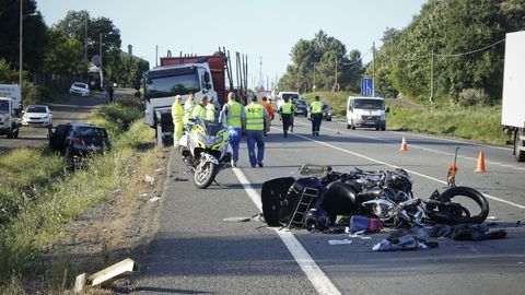 Octubre comienza de la peor manera posible para el tráfico, con dos muertos en un solo día en otros tantos accidentes. El primero ocurrió ayer por la mañana en el término municipal de Santiago. Una violenta colisión entre un coche, una moto y un tráiler se saldó con un muerto, un herido grave y otro leve. El siniestro se produjo poco después de las ocho de la mañana en el kilómetro 51,400 de la carretera N-550, a la altura de la parroquia de Marantes (Santiago), muy cerca de Sigüeiro (Oroso). Aunque las causas del siniestro están aún bajo investigación por parte de la Guardia Civil de Tráfico, las primeras pesquisas apuntan a que el motorista pudo haber invadido el carril contrario y fue a chocar contra el turismo, un Renault Mégane, que se estrelló después frontalmente contra el camión.