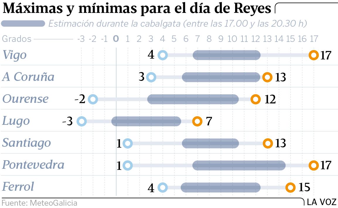 La llegada de las carrozas a la comunidad está prevista para hoy sábado, sobre las cinco de la tarde. Al comienzo de los desfiles las temperaturas serán bajas, pero soportables debido a la presencia del sol, que suavizará algo el ambiente. Las máximas podrían oscilar entre los diez y los doce grados en algunos puntos de la mitad sur. Sin embargo, a medida que sus majestades vayan recorriendo los pueblos y las ciudades de Galicia caerá la noche y el termómetro comenzará a descender en picado. Las cabalgatas terminarán con registros por debajo de los ocho grados de forma generalizada. En ciudades como Ourense o Lugo, los Reyes se despedirán con temperaturas inferiores a los cuatro grados.