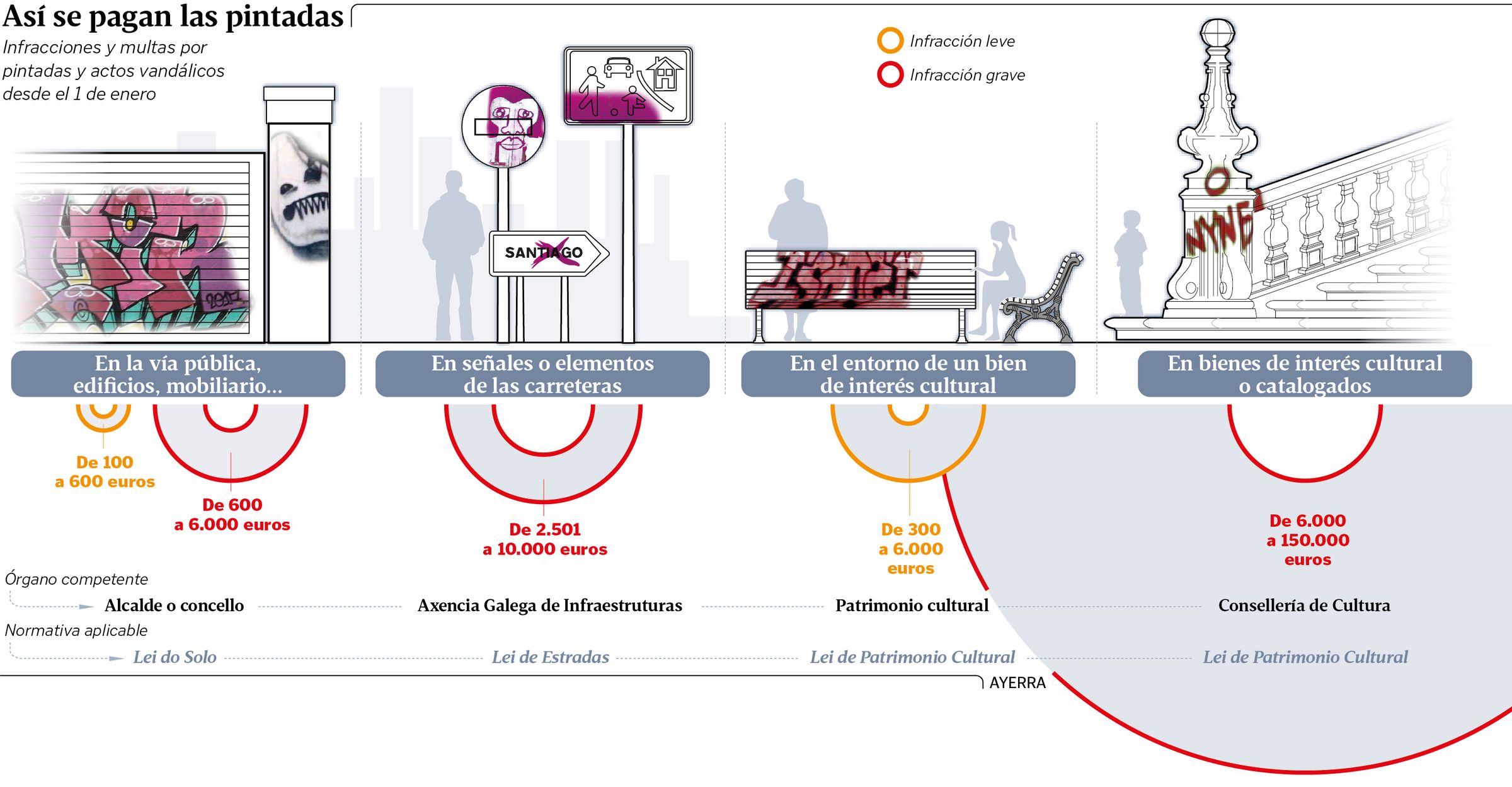 La pintada ordinaria que genere daños o deslucimiento en propiedades públicas o privadas sin especial valor patrimonial ya estaba recogida en la polémica Ley de Seguridad Ciudadana y dejaba a las instituciones con competencias en esta materia (desde el Estado hasta los concellos) aplicar sanciones entre los 100 y los 600 euros. Se hace así si afectan al mobiliario público y los paramentos exteriores de edificios e instalaciones, incluyendo los muros y cerramientos de todo tipo. La Lei do Solo gallega también la considera leve, pero desde este enero aplica otra tramo para los casos graves que va desde los 600 a los 6.000 euros cuando los daños sean irreparables y se den circunstancias de reincidencia en el autor o autores. Para introducir estos cambios, el PP presentó una enmienda que se incorporó al texto de los presupuestos, por lo que ya está activa desde el día 1.