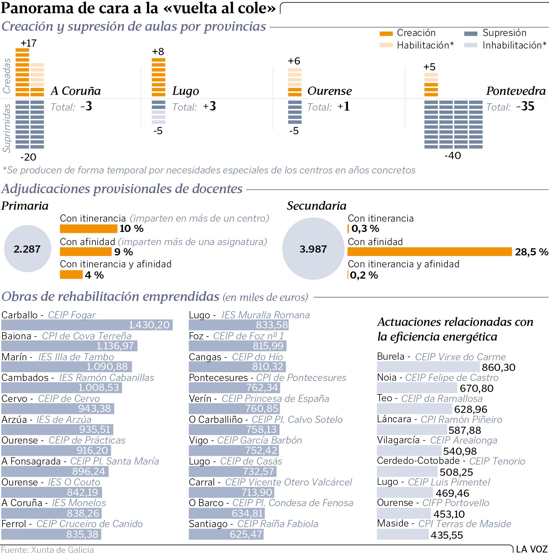 01 sep 2019 . Actualizado a las 05:00 h.Los catálogos de las superficies comerciales empiezan a llenarse de mochilas, mandilones y estuches, y todos los escaparates de las librerías llaman a reservar los libros de texto. Son las señales inequívocas de que comienza el curso, que en Galicia arrancará el día 9 en la universidad, el 11 en primaria y el 16 en secundaria. Entre los saludos de los primeros días, también alguna despedida: hay seis escuelas unitarias menos por no llegar a seis alumnos y en el cómputo total, hay 34 aulas menos en los colegios gallegos, según datos de la Consellería de Educación, aunque los sindicatos incrementan hasta 40 los cierres de unidades, y por tanto la pérdida de puestos de trabajo, de entre 55, según CC.OO., y 62, según la CIG.