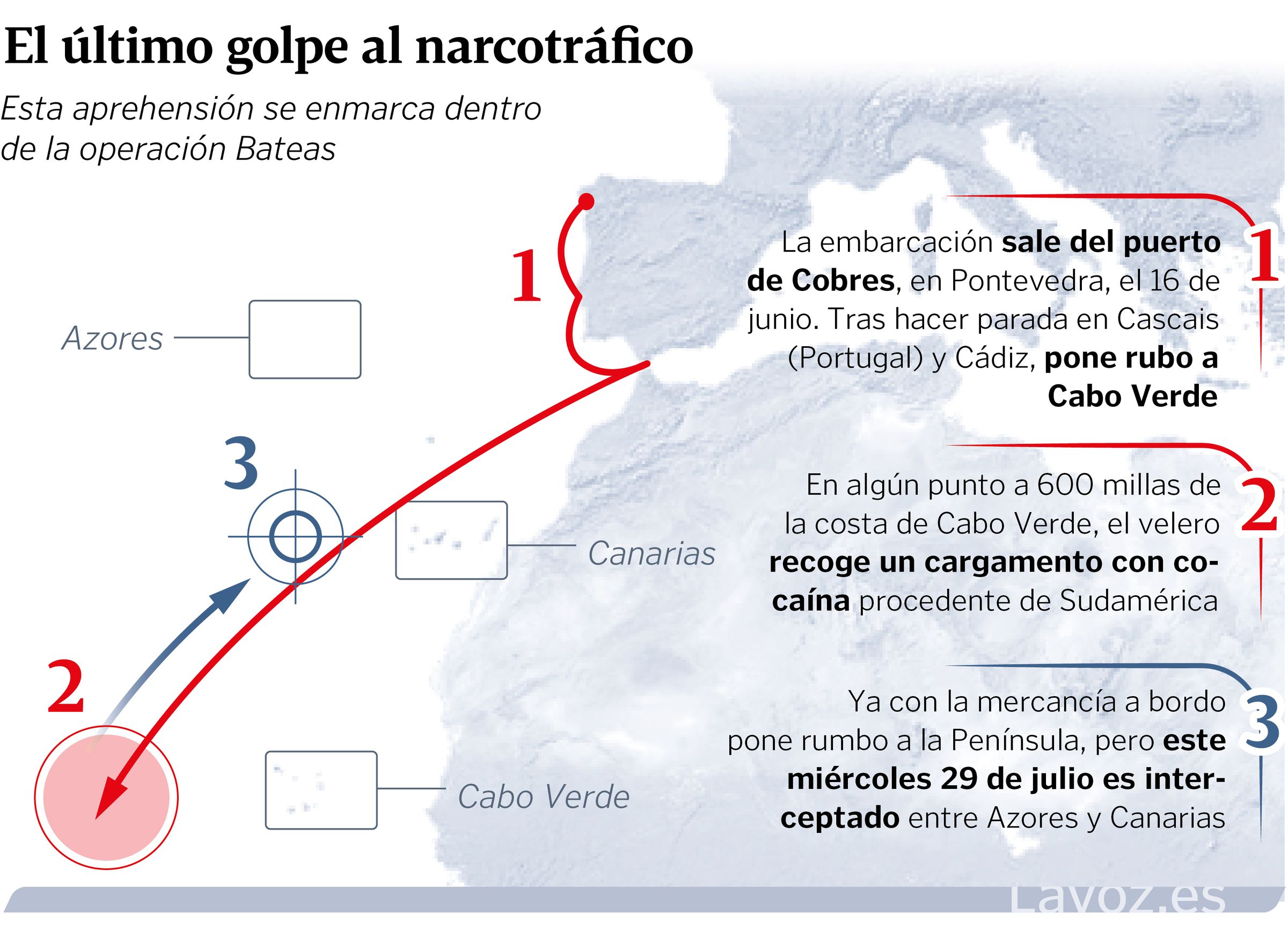 Una vez preñado el barco con 39 millones de euros en cocaína se puso rumbo al norte. Todo indica que a algún punto próximo a Galicia o puerto, siempre simulando una travesía más entre amigos propia de cualquier verano. Pero la cortina de humo se disipó y, al poco tiempo de trasvasar la mercancía, los cinco custodios del alijo atisbaron por la proa y a los lejos el buque de la Armada. La sorpresa saltó ya a bordo, la investigación identificó a los cuatro tripulantes que zarparon en junio desde la ría de Vigo (dos españoles, un portugués y un brasileño). No contaban con el quinto tripulante, también español, «del que se desconoce el medio utilizado para llegar al velero». Ahora, el Nergha, custodiado por la Armada, navega hacia al puerto de Las Palmas para, la próxima semana, completar su registro y concretar de manera precisa el peso de la droga incautada.