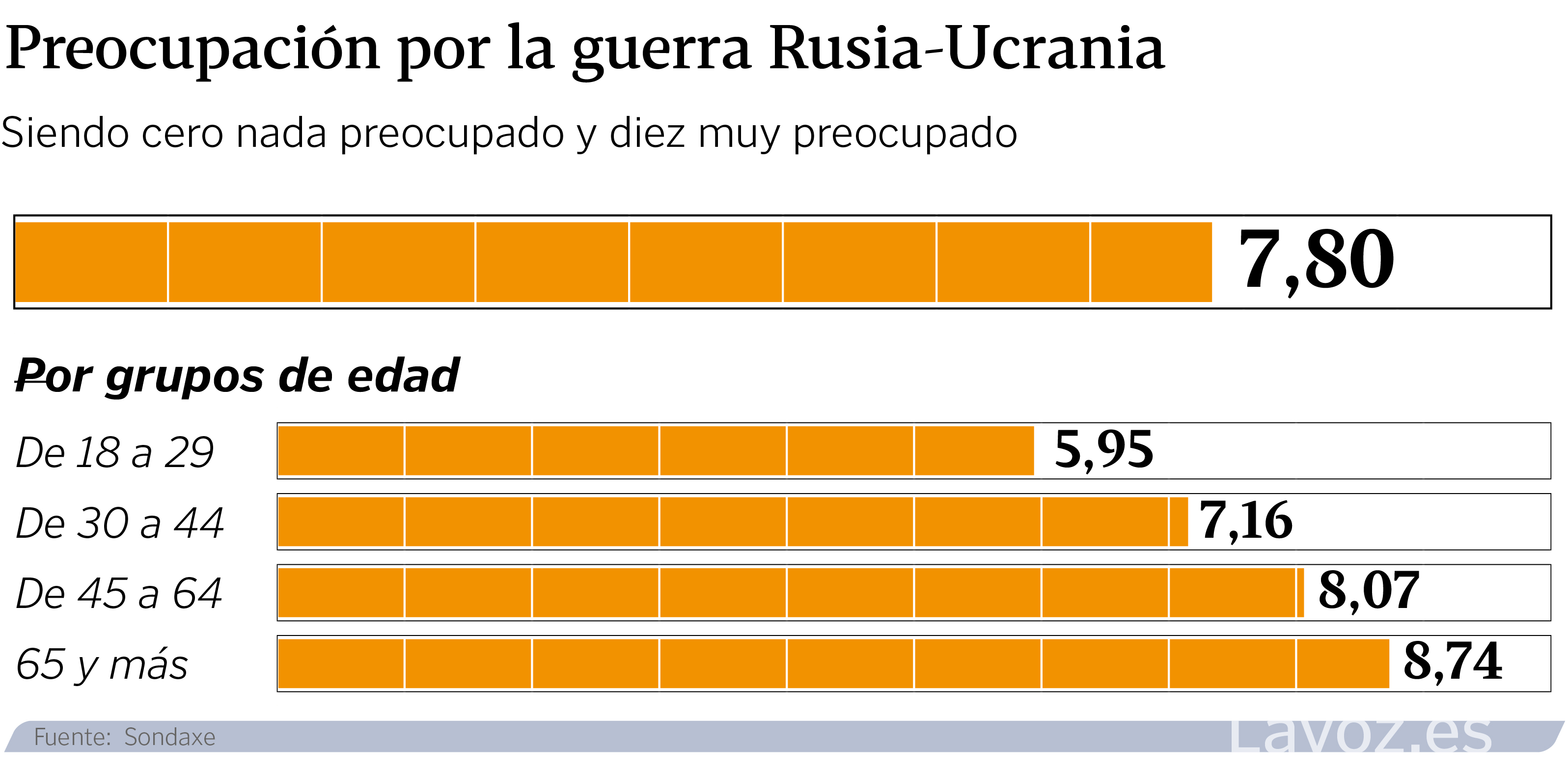 La invasión de Rusia en Ucrania supera ya el tercer mes, provocando una crisis migratoria sin precedentes en Europa desde la II Guerra Mundial y una escalada de precios global. Preocupa mucho a los mayores, por encima del 7, pero no tanto a los menores de 29 años. En localidades con menos de 20.000 habitantes, la incertidumbre sobre la guerra supera el 8.
