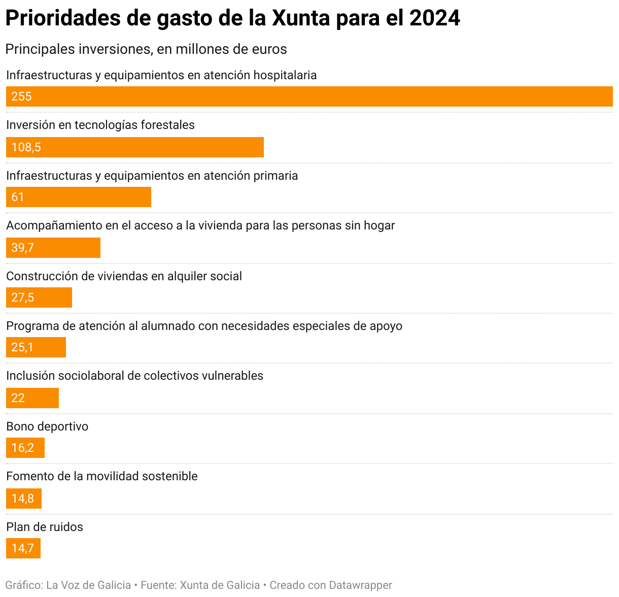 Por otra parte, el conselleiro de Facenda también desgranó inversiones previstas en las cuentas, desde 255 millones de euros para atención hospitalaria hasta 27,5 millones para la construcción de viviendas sociales, 14,3 millones para el Centro de Ciberseguridade de Galicia o 25 millones para el programa de atención al alumnado con necesidades específicas. El presupuesto, concluyó, parte de los objetivos de «investir en estabilidade, investir nas persoas, e investir no futuro».